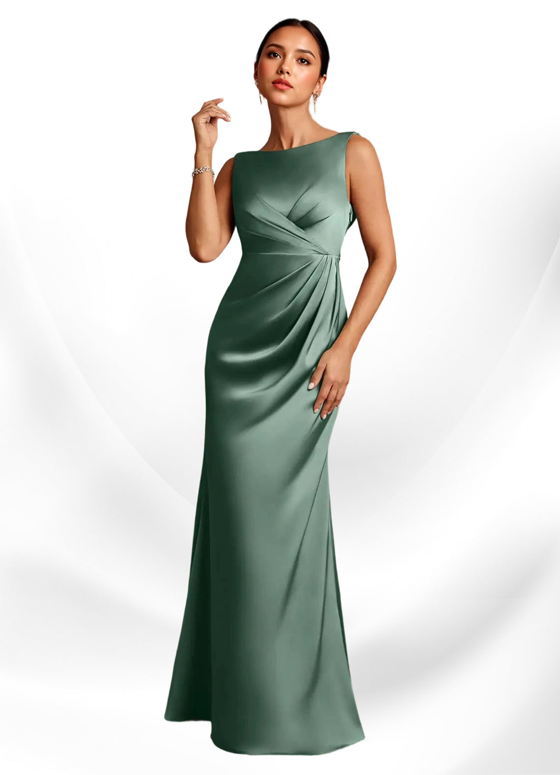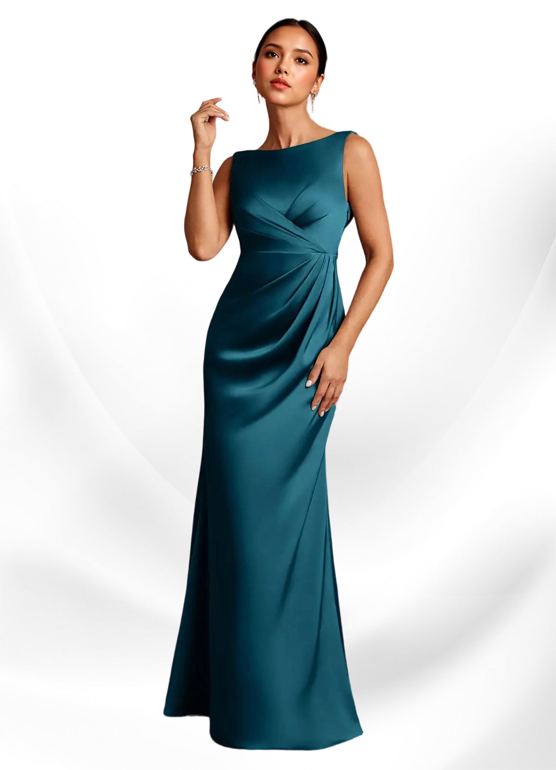 product details Description The Baltimore Mother of the Bride Dress exudes timeless sophistication with its floor-length A-line silhouette in stretch satin. Featuring a sleeveless design with a boat neckline, a...