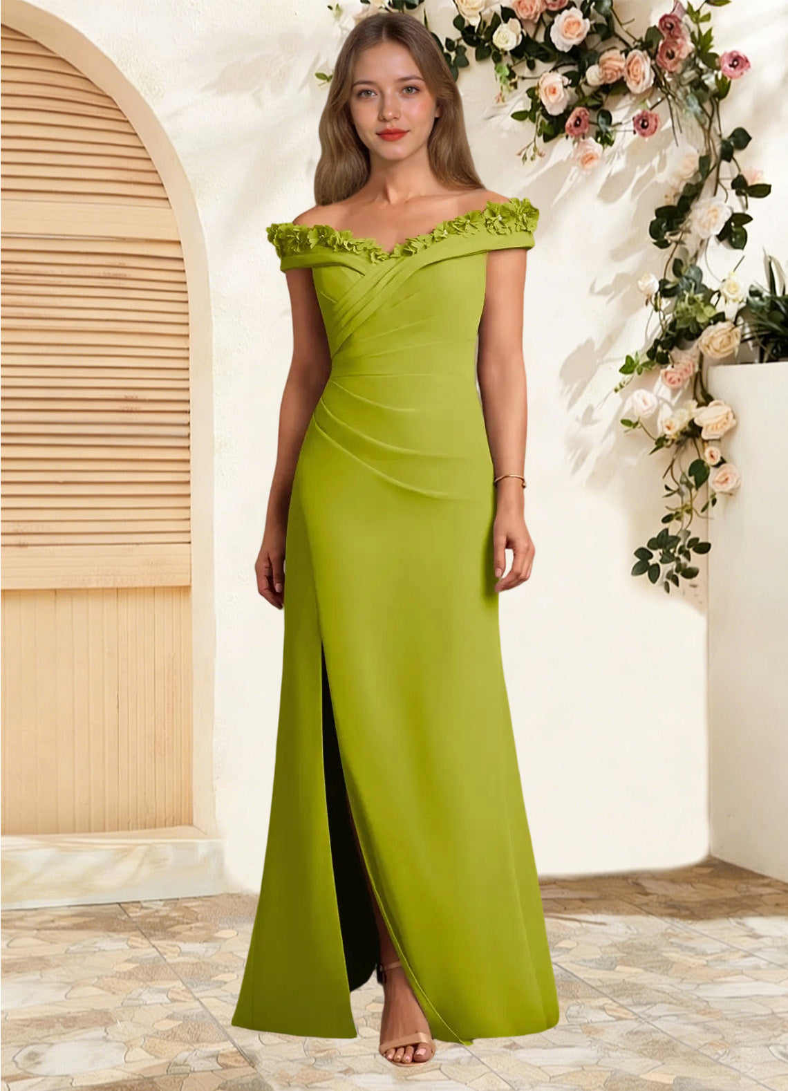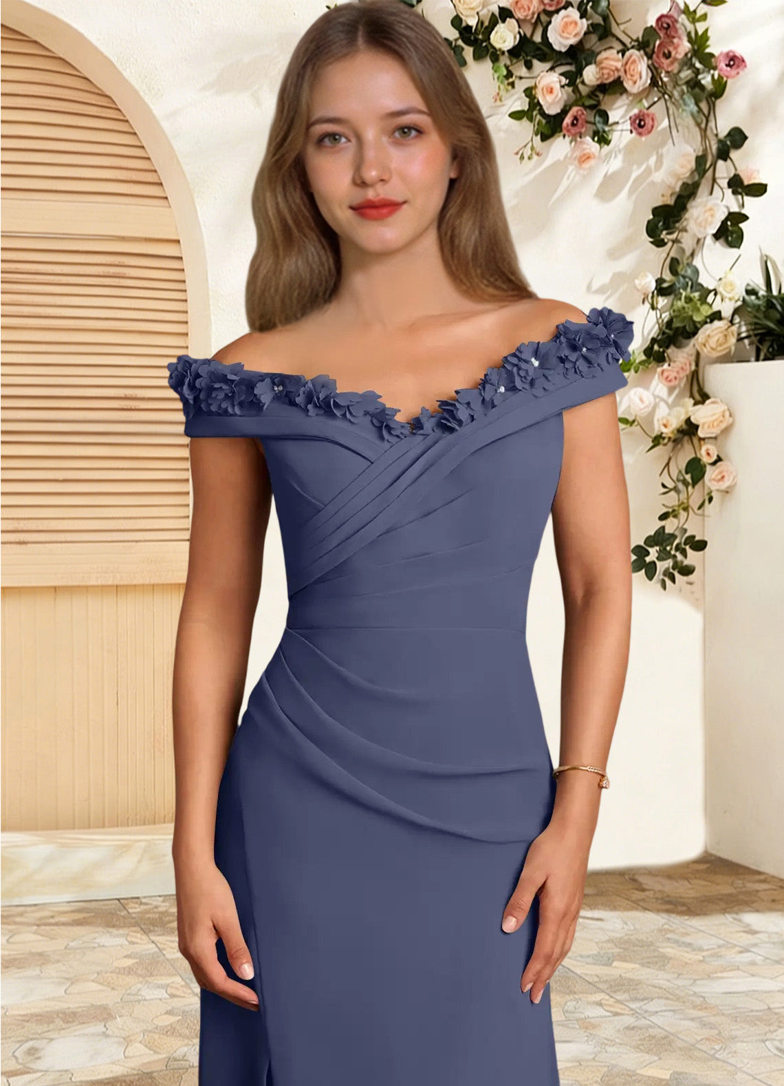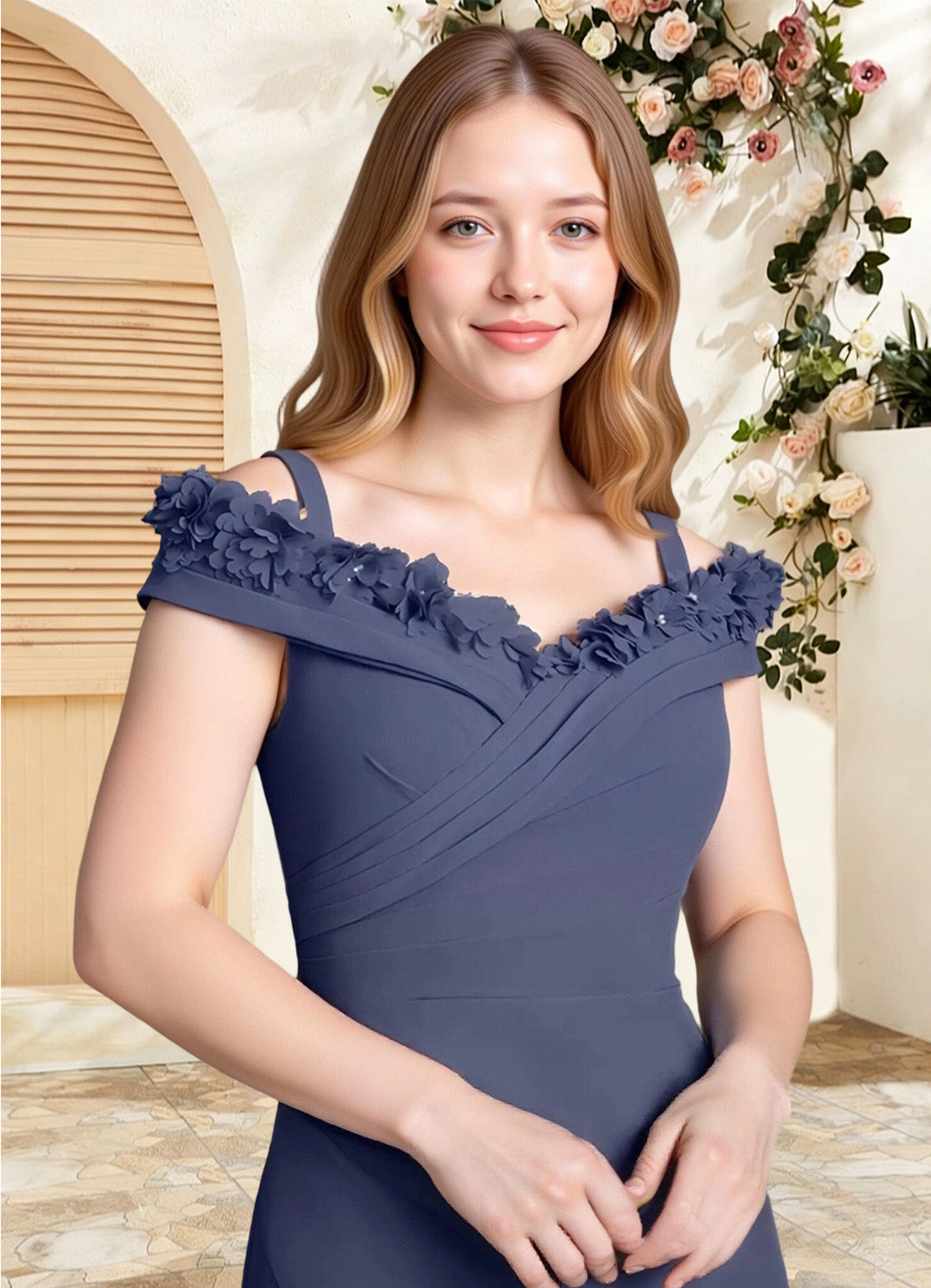 The Jettie dress is a floor-length mother-of-the-bride gown in a sheath silhouette crafted from chiffon. It features a wide V-neckline with a fold-over detail trimmed in 3D flowers and optional removable straps for added support. Light pleating through the bodice and hips enhances the shape, while a leg slit adds a touch of elegance.