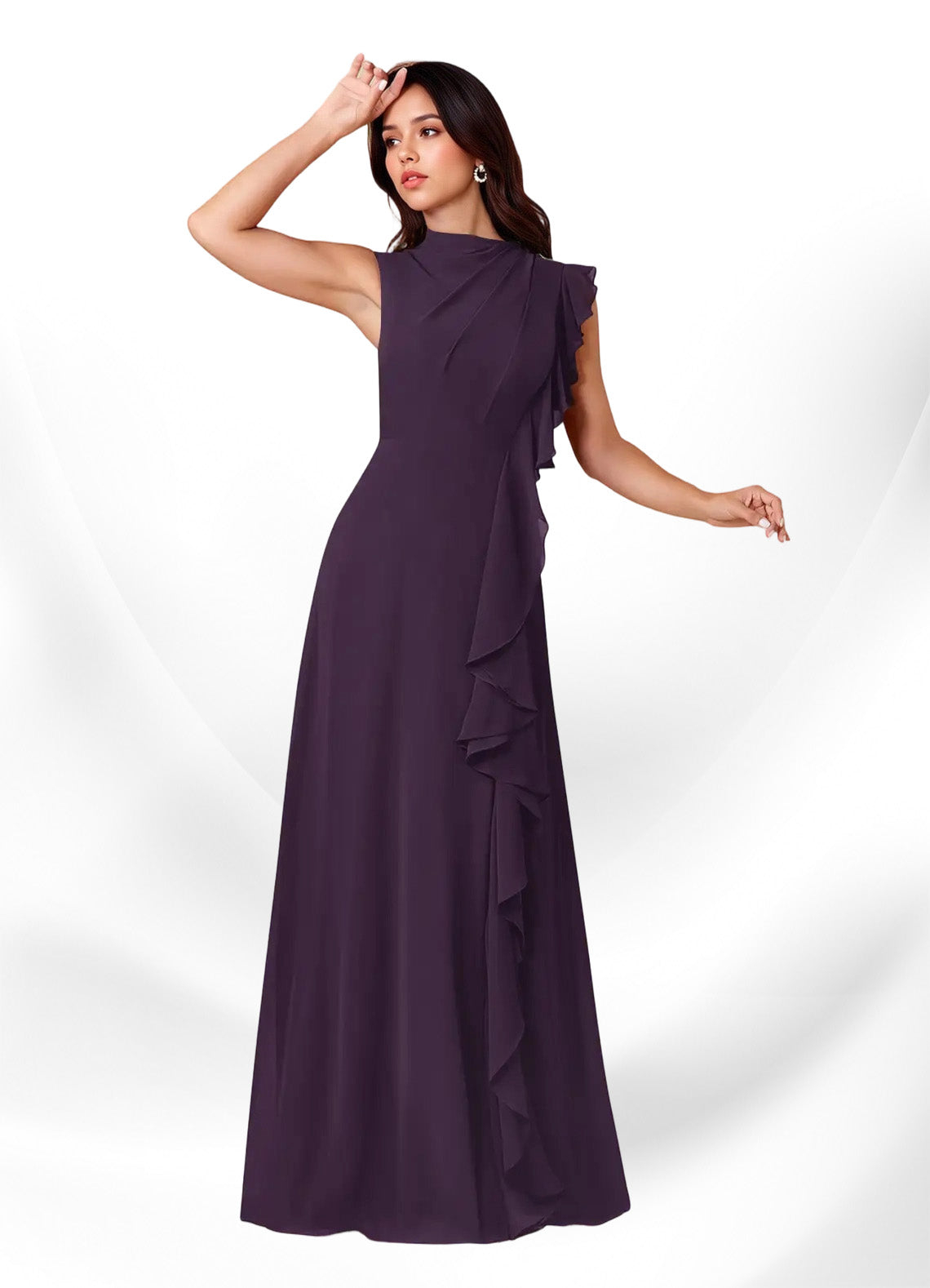 Meet Narine, our chiffon mother of the bride/groom dress. She features pleats along her shoulder, a button shoulder closure. The highlight of this dress is her gorgeous ruffle from the shoulders down through the bodice and onto her leg slit.
